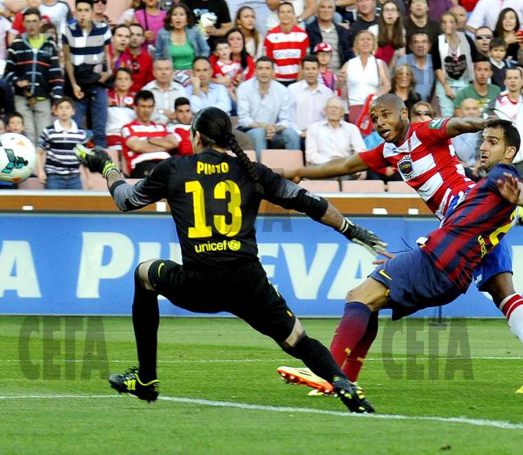 | СНИМКА: ЕПА/БГНЕС Алжирецът Ясин Брахими (в средата) бележи гола, с който "Гранада" победи с 1:0 като домакин "Барселона" в 33-тия кръг в Испания. Това бе втора загуба с 0:1 за каталунците през седмицата, след тази от "Атлетико" (М) в Шампионската лига. За първи път от август 2008 г. насам "Барса" не отбелязва гол в два поредни мача. Други срещи: "Бетис" - "Севиля" 0:2, "Селта" - "Реал Сосиедад" 2:2, "Виляреал" - "Леванте" 1:0, "Реал" (М) - "Алмерия" 4:0, "Осасуна" - "Валядолид" 0:0. Води "Атлетико" (М) със 79 т. и мач по-малко, пред "Реал" (79), "Барселона" (78) и др. |
