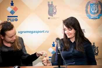 | Антоанета Стефанова и Катерина Лагно се чукат с яйца на Великден, веднага след партията им от предпоследния, 10-и кръг на турнира в Ханти Мансийск. Българката и украинката направиха реми на дъската. |