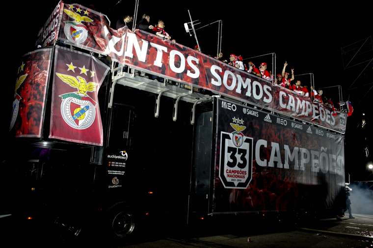 Играчите на "Бенфика" празнуват спечелването на 33-тата титла на Португалия на площад "Маркес де Помбал" в Лисабон. "Орлите" победиха с 2:0 "Олянензе" в мач от 28-ия кръг на шампионата и са недостижими на върха.