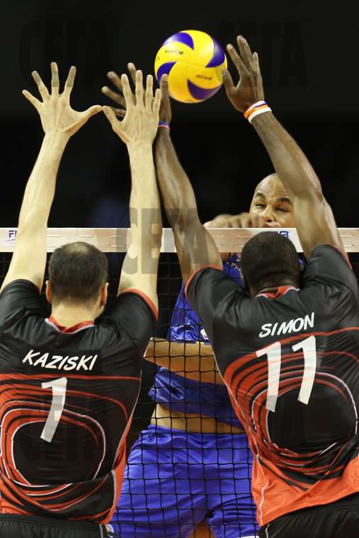 | СНИМКА: FIVB.ORG Матей Казийски (№1) и кубинецът Роберланди Симон (№11) се опитват да спрат с двоен блок атака на бразилския център на УПЦН (Сан Хуан) Жуниор при загубата на "Ал Райян" с 2:3 (-19, -20, 17, 18, -11) гейма в последен мач от гр. Б на световното клубно първенство по волейбол в Бело Оризонте (Браз). Резултатът класира и двата тима на 1/2-финалите, като катарците заеха първо място в групата и ще срещнат домакина "Сада Крузейро", а аржентинците завършиха втори и ще спорят за място във финала с победителя в гр. А "Белогорие" (Рус). |