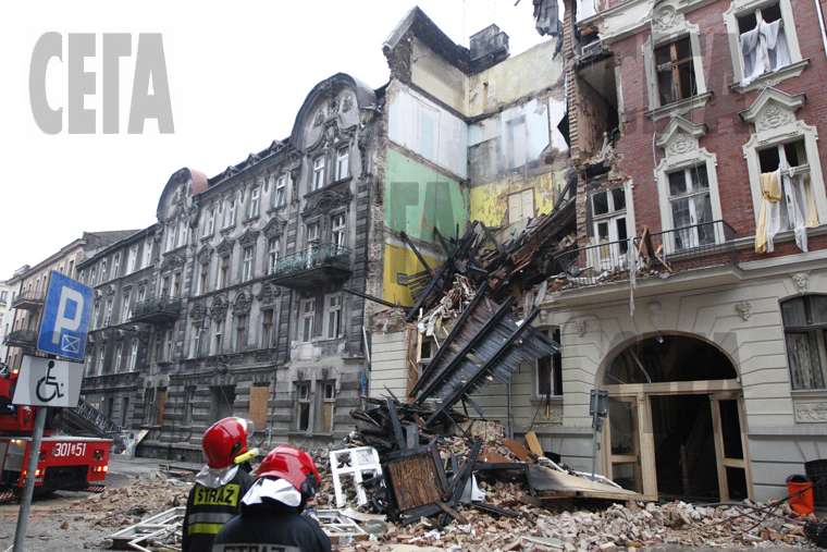 Пожарникари и спасителни екипи работят край пострадала сграда в полския град Катовице. Битова експлозия разруши 3 етажа от къщата рано вчера сутринта, като рани сериозно един човек.