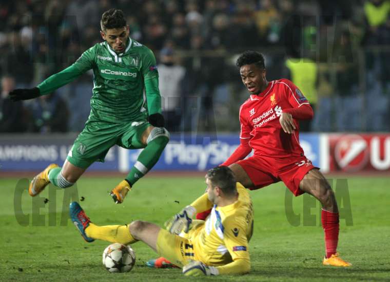 Вратарят Владислав Стоянов предотвратява гол в мрежата си, като избива шут на излезлия срещу него нападател на "Ливърпул" Рахийм Стърлинг (вдясно).