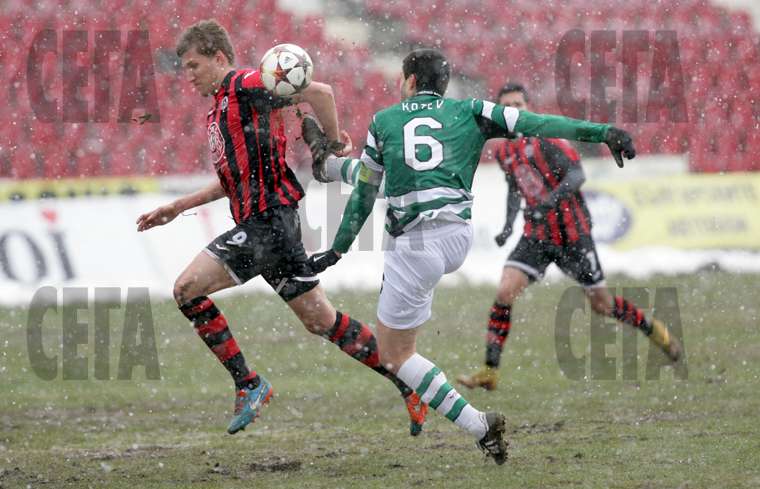 | Защитникът на "Черно море" Кирил Котев (№6) чисти топката пред автора на първия гол за "Локомотив" Преслав Йорданов под обилния сняг по време на вчерашния мач. |