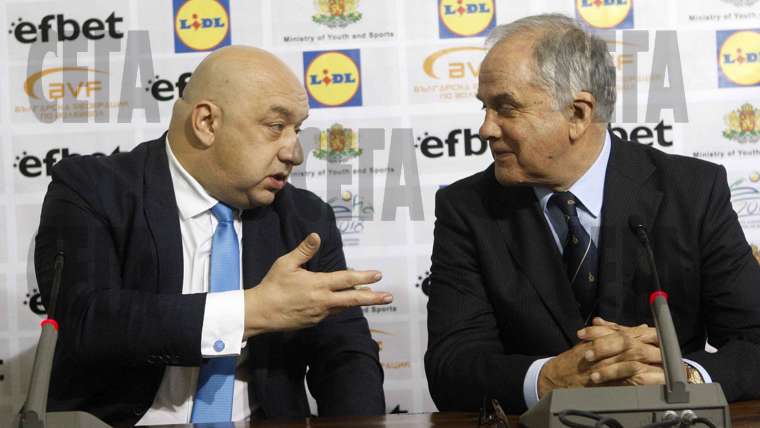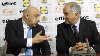 | Спортният министър Красен Кралев (вляво) и волейболният бос Данчо Лазаров обсъждат домакинството на световното първенство по волейбол, преди да запознаят медиите с подробности. |