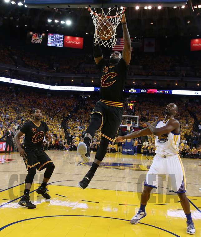 | СНИМКА: ЕПА/БГНЕС Лидерът на "Кливланд" ЛеБрон Джеймс е забил топката в коша на "Голдън Стейт" по време на мач №5 от финала на НБА миналата нощ. Краля завърши с общо 41 т., колкото наниза и съотборникът му Кайри Ървинг, благодарение на което "кавалерите" разгромиха шампиона със 112:97 като гости и го лишиха от първата възможност да триумфира с титлата пред своите фенове в зала "Оракъл Арина" в Оукланд. При общ резултат 3-2 за "Голдън Стейт" серията до 4 победи ще продължи в зала "Куикън Лоунс Арина" в Кливланд на 16 юни, а при необходимост решителният мач №7 ще е обратно в Калифорния. |