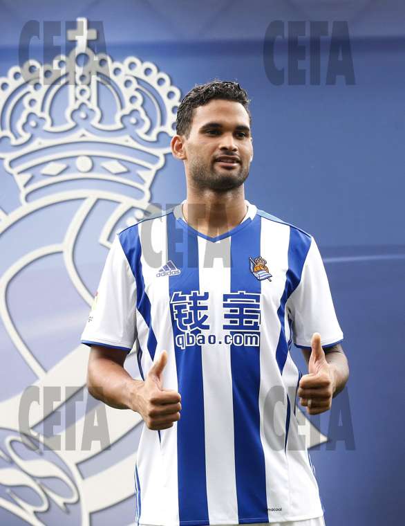 | СНИМКА: ЕПА/БГНЕС Бразилският нападател Вилиян Жозе позира видимо доволен при представянето си като нов футболист на "Реал Сосиедад". Той подписа за 5 сезона с клуба от испанската Примера дивисион, който го купи за 6 млн. евро от уругвайския "Малдонадо". Преди това Жозе е играл в "Гремио", "Сантос", "Лас Палмас" и "Сарагоса". |