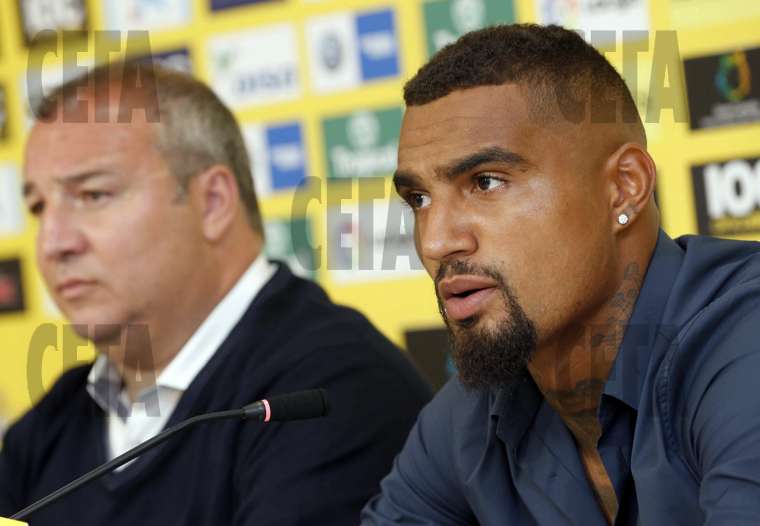 | СНИМКА: ЕПА/БГНЕС Бившият ганайски национал Кевин-Принс Боатенг (вдясно) седи до президента на "Лас Палмас" Мигел Анхел Рамирес и обяснява пред медиите, че напуска испанския клуб по лични причини, за да се върне при семейството си в Италия. 30-годишният бивш халф на "Херта", "Милан", "Шалке 04" и др. игра една година за отбора от Канарските о-ви. |