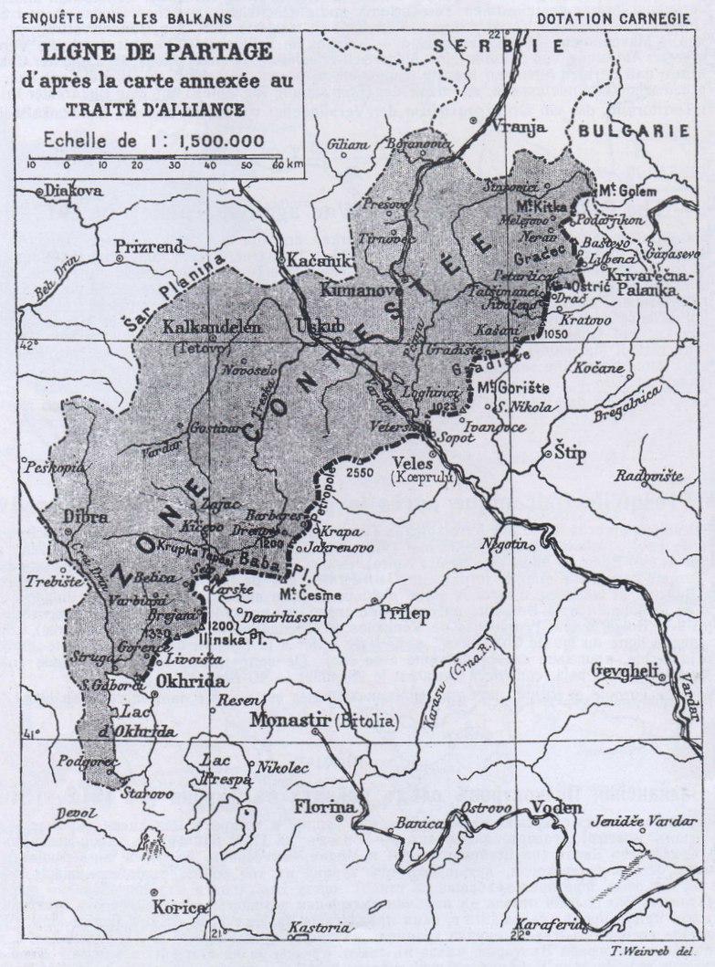 | Яз сакам да попитам уважаемият ПАРАГРАФ, щом е толкова по договорите, защо Сърбия НАРУШИ договора си с България и заграби "Безспорната зона" в Македония след Първата Балканска война. Ето и карта на "Спорната зона" (по долу), ако случайно някой не знае, че само тази зона е била под "диспут" според съглашението и само тя е трябвало да се разделя според народен плебесцит. Тука сакам да дам още малко разяснение за да спестиме неграмотни въпроси от публиката. Втората Балканска война се започна не защото България отказа да участва в диспут/плебесцит за "Спорната зона", а защото Сърбия окупира по-голямата част от вардарска Македония, отказа да изпълни предварителният договор(съглашението) с България и оспорва "Безспорната зона" след като я беше вече окупирала. Сърбия настоява, че разделението вече трябвало да се извърши според окупационни зони а не по предварителният договор. Междувременно, сръбските войски започват масови чистки и истъпления, преселвания и гонения на българите в Макединия за да си подсигурят победа ако се стигне до плебесцит в "Спорната зона", която и тогава е имала известно количество албанци на които сърбите са разчитали (Сърбите никога не са имали малцинство във Вардарска Македония). Масовите истъпления и палежи от страна на сръбските войски дава повода за началото на Втората Балканска Война, макар България да е била превъзхождана. Съотношение на етносите през този период: Редактирано от - garamel на 22/2/2008 г/ 08:22:58 |