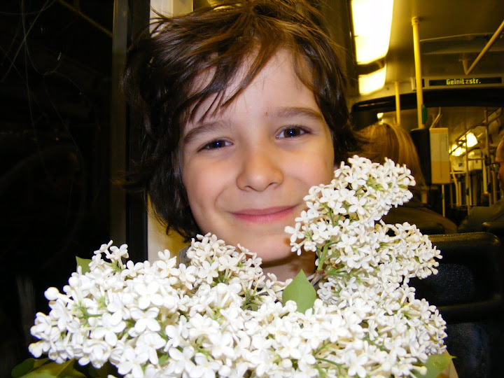 За снимката, симпатичното момче и прекрасната цветна песен Сибила, а ние на 1 май, празнувахме седмия Рожден ден на растящия Малък принц Това е картичката, от немския му дядо Вечерта, преди РД. Много обича да се вози в трамвай |