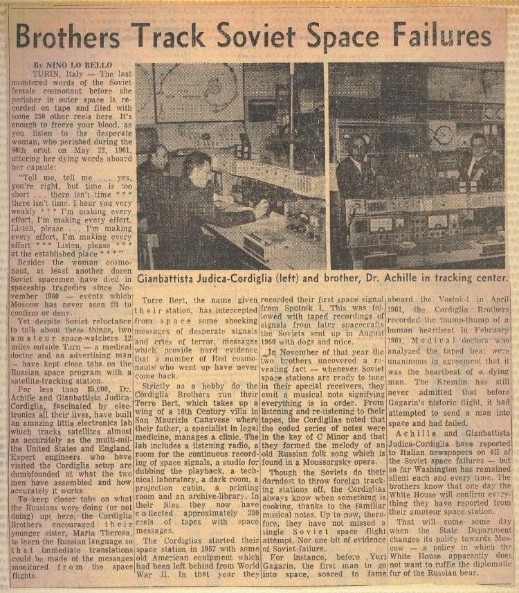 | на 22 май двама братя от торино, италия, радиолюбители, улавят глас от космоса. женски глас. от думите, от гласа и, от дълбокото отчаяние, кръвта замръзва в жилите. "кажи ми, кажи ми...да, прав си, но времето е много малко...няма време...много слабо те чувам...правя всичко възможно, правя всичко възможно...чуй ме, моля те...на това място... това са последните и думи. тя остава завинаги в космоса, безименна. и не само тя... |
