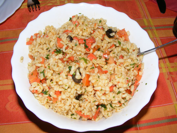 | Аз направих само тази скромна салата от булгур, маслини, пушена сьомга, домати, магданоз и лимон. За мезе - бяло вино и ракия, които без малко да забравим в хладилника. Танците бяха десерта, а китките ни се докосваха с все още вързаните мартенички, понеже все още не сме забелязали ни един щъркел. Честита Първа Пролет на слънчевото момче и звездната му сестричка. |