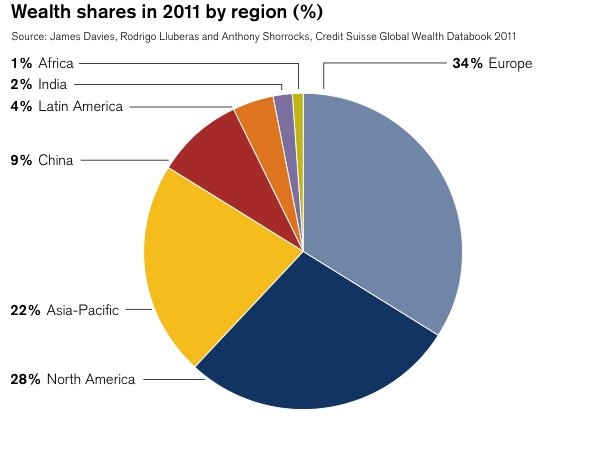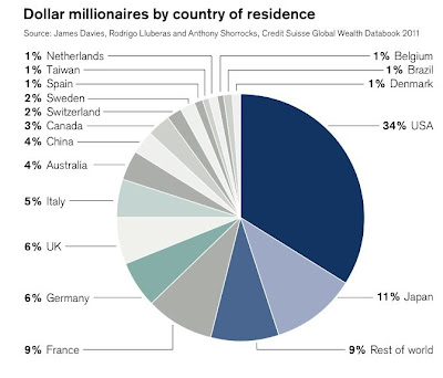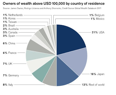 0,5 % от населението на света притежава 38.5 % от световният капитал. Китай, Индия, Латинска Америка и Африка представлява 56 % от световното население, но притежават само 16 % от световното богатството. В Съединените американски щати живеят 21 % от хората, които имат повече от $ 100 000 на човек от това богатство. В Япония живеят16 % от тези хора. Натисни тук | |