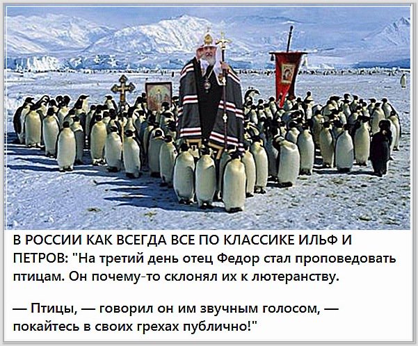 Опасаемся за патриарха Кирилла. Как известно, среди пингвинов гомосексуальные контакты встречаются чаще гетеросексуальных. |