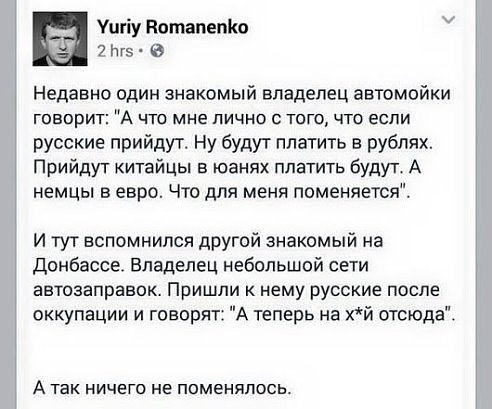 Николай Иванов 38 mins · 10 шоковых впечатлений россиян в Украине 1. Первый шок наступает после того, как россияне пробуют наши продукты и еду. 2. Второй, когда узнают сколько эти продукты стоят. 3. Третий, когда они пытаются найти на улицах хоть одну Ладу или Жигули. 4. А тут ещё полицейский вежливо спрашивает на улице не нужна ли им карта Киева. 5. Когда за неделю пребывания они не встречают ни одного таксиста кавказской национальности. 6. Когда россияне приезжают в Одессу — все вокруг говорят исключительно по-русски, но при этом из каждой форточки висит жовто-блакитный флаг, а по субботам многие ходят в вышиванках. У россиян начинается когнитивный диссонанс. 7. В первые дни, когда в Киеве к ним на улице обращаются на украинском языке, они инстинктивно сжимаются, беспомощно смотрят на меня, всё — сейчас будут резать за русский язык. Шок у них наступает, когда на их робкие попытки ответить, собеседник в ту же секунду тоже переходит на русский даже не меняя интонации. 8. Когда россияне общаются в Киеве с донецкими они начинают их жалеть. Это происходит всегда. Обычно донецких хватает минуты на 2, потом они начинают в свойственной им жесткой манере объяснять россиянам куда они могут засунуть свою жалость вместе с телевизором, добровольцами и русским миром. 9. Когда в Киеве идет демонстрация, к примеру учителей, ты им говоришь, пошли посмотрим, что требуют. А россияне испуганно говорят, ты что, сейчас же разгонять будут. Это вызывает дикий смех всех окружающих. 10. Когда в большой компании или в людном месте кто-то вслух говорит, что Порошенко мудак, потому что тормозит реформы. Россияне при этом почему-то начинают нервно оглядываться. https://www.facebook.com/greyma57er/posts/911102912349735 |