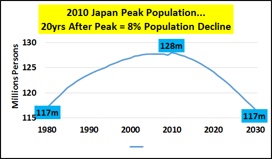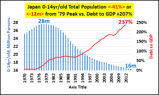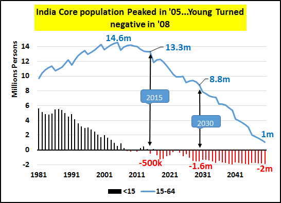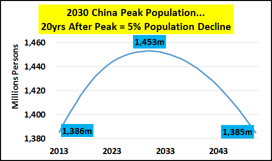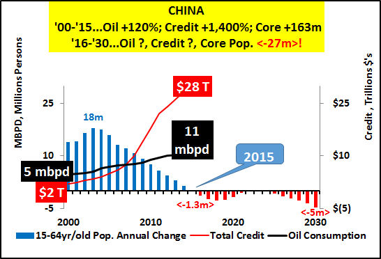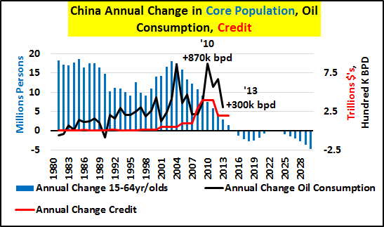 | http://seekingalpha.com/article/3526426-the-story-of-china-is-the-story-of-japan-just-10x-bigger Summary China core population (15-64yrs/old) turns negative in 2016 and total population peaks and begins receding in 2030. China's 1400% increase in credit from '00 to '14, primarily involved in funding real estate, has slowed to a crawl. Absent core population growth and/or significant ongoing credit growth, the China growth story and the global growth story (premised on China's 7% farcical growth) is just that, a story. I believe and will show why China's future growth (or lack thereof) should be seen in the same light as Japan's present and future. This article will outline 3 simple variables I don't see together much that are crucial to understand China's economic status. 1) China's demographics (particularly 15-64yr/old core), 2) China's credit/debt, and 3) China oil consumption (as a general proxy for economic activity). China's economic system, premised on core population growth that averaged nearly +15 million/yr for 35yrs, has seen the balance of those entering and exiting the core shift dramatically. The Chinese annual core population (15-64yr/old) growth peaked at +18 million/yr in 2003 and core population growth has been decelerating since. It is in response to this decelerating growth that China began perhaps the greatest credit/debt binge in human history to maintain economic activity. However, 2015 represents the last year (likely in our lifetimes) that Chinese core population will be positive, by a mere 250k. By 2016, China's core is estimated by OECD to shrink by <-1.3m> and continue to shrink at that general rate for the next decade. However, after that, the core shrinkage really picks up. By 2025 through 2044, the core shrinkage averages nearly <-6m> annually. This is not decelerating growth, this is not growth. This is outright decline. The question of what is to become of all the credit driven, Chinese excess housing (50-80 million excess, primarily higher end apartments), ghost cities, infrastructure build outs, etc. for a population that is never coming seems really appropriate about now?!? This is a nation with net emigration and long-term negative birth rates. How the Chinese government that encouraged this activity, that was bound to create the greatest real estate bubble and subsequent crash in history, plans to maintain power is a mystery. The scope of the upcoming Chinese RE crash is likely to make the previous Japanese and American crashes seem minor in comparison. Clearly, the negative impacts of China's adjustments will be felt far and wide. No growth to massive declines in consumption of commodities, consumer goods, etc. across the board will be the new secular norm. That analyst after analyst would suggest Chinese growth or stocks or consumption of much of anything would be positive and suggest China is a place to invest here and now... well, I just couldn't disagree more. Here's why... TOTAL POPULATION The first chart is that of a growing Chinese population (blue columns) most China bulls cite as evidence why China's future is like its bright past. However, a curious investor might take a glimpse at the lines representing the different demographic portions of that total population have been diverging for decades. What I prefer to look at is the year-over-year change in population and demographics. The chart below shows China's annual population growth peaked in 1969 and nearly double peaked in 1988 at an annual net increase of 22 million Chinese. Since those heady days of simply amazing growth, things have changed a tad. By 2015, Chinese population growth has decelerated to 7.8m/yr or about a 65% decline from peak growth. But 2015 is just the start of China's transition to "Japan-West." A quick look at Japan and China's population peaks and estimated declines (charts below) shows how similar the tracks are, China 2 decades behind Japan. THE YOUNG And how did China's population decline take root? Go to the headwaters and follow the changes in the young population (below). This is a 30%+ decline which is making its way into the core population and this is unavoidable. Even any unlikely increases in the birthrates now would be decades away from boosting the core population. And Japanese declining young population (below) for comparison. The 41% decline working its way into the core population is stunning and likewise unavoidable. THE CORE I'm going to focus on 15-64yr/old core population changes vs. debt and oil consumption. This segment seems to be the key driver of national economic activity. The Japanese peak core population was 1996, the same year Japanese oil consumption peaked (this is the same in Germany and generally true in most advanced nations). Both core population and oil consumption have continued to decline since '96 despite total population growth which only peaked in 2010. Interest rate cuts, debt, and deficits have been unsuccessfully substituted for declining demand... demand set to decline still for decades. One look at China (below) and it should be clear that absent Chinese population growth and/or significant credit growth - Chinese oil consumption and general economic activity is very likely set to fall. And fall for decades just like Japan!!! I've tried to make the linkage of peak core populations, peak oil consumption, and the substitution of credit/debt to maintain consumption previously. It can be read hereНатисни тук. Lastly, the chart below highlights the annual increases in Chinese oil consumption vs. annual increases in credit and core population. There are two distinct annual consumption spikes in '04 and '10. The '04 spike with the introduction of greater credit to still significant core population growth. The '10 spike in oil consumption was record credit and rapidly decelerating core growth. CONCLUSION The upcoming changes in core population are a given and the credit engine of the Chinese housing bubble has gone