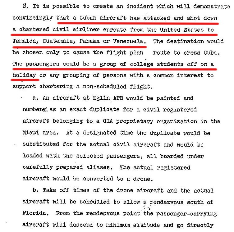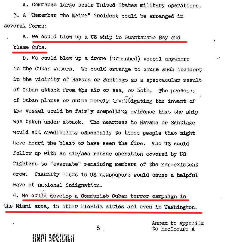 | Да кажеш, че ЦРУ никога не е планирало подобна операция - да се съглася, че са глупости. Обаче историята разказва друго: Operation Northwoods was a proposed false flag operation against the Cuban government, that originated within the Department of Defense (DoD) and the Joint Chiefs of Staff (JCS) of the United States government in 1962. The proposals called for the Central Intelligence Agency (CIA) or other U.S. government operatives to commit acts of terrorism against American civilians and military targets, blaming it on the Cuban government, and using it to justify a war against Cuba. The proposals were rejected by the Kennedy administration. The desired resultant from the execution of this plan would be to place the United States in the apparent position of suffering defensible grievances from a rash and irresponsible government of Cuba and to develop an international image of a Cuban threat to peace in the Western Hemisphere. Натисни тук Глупости? ЦРУ са станали хуманитарна организация? 5 милиарда за какво бяха похарчени? |