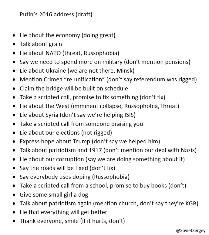«Да, действительно, имела место небольшая задержка, и наши японские коллеги были поставлены в известность об этом. Это связано просто с рабочим графиком президента, в том числе и с сирийскими делами», — сказал Песков. https://lenta.ru/news/2016/12/15/onneopazdyvaet Похоже, Песков решил вообще не париться с изобретением отмазок. Опоздание связано с рабочим графиком - это вообще как? График составлялся заведомо невыполнимый или путинский визит в Японию - вне графика оказался? ![]() |