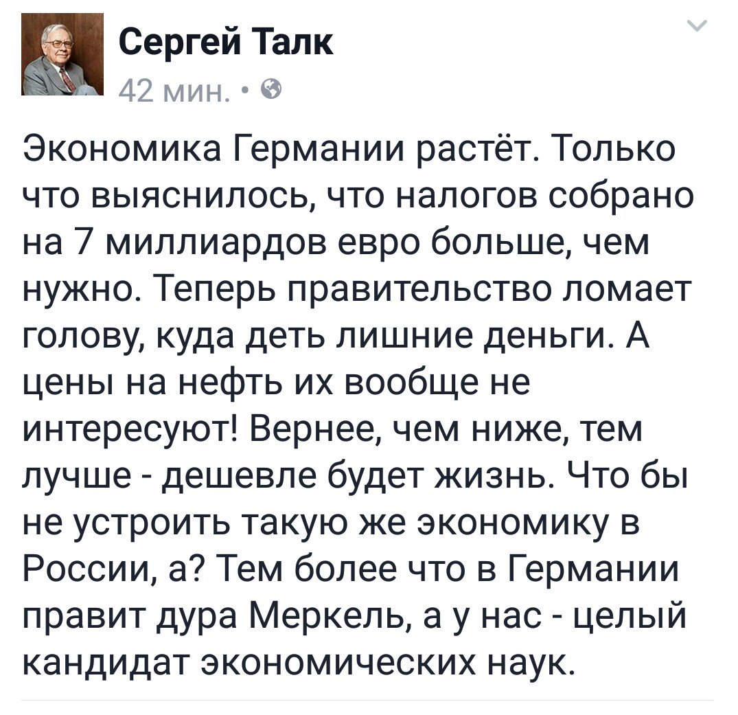 rki 17 Яну 2017 22:51 Мнения: 20,042 От: Albania Скрий: Име,IP Эволюция взглядов Путина: 2000: "жены подводников с Курска — десятидолларовые проститутки". 2017: "московские проститутки — лучшие в мире". Не е съвсем така, не чети както дявола евангелието... 10 доларовите са практиканките в Белия Дом при демократа Клинтон..... Жалко , че тръмп развали работата с прости господи в белия дом.... ![]() |