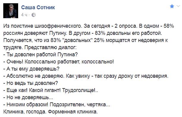 | Людк, а Людк! Глянь, че делается! «Не верю, что президент Путин с 2018 года — это благо для России» В Партии роста бизнес-омбудсмена Бориса Титова предложили Путину уйти с поста президента Партия роста, лидером которой является бизнес-омбудсмен Борис Титов, с 17 августа запускает процедуру голосования за своих кандидатов в президенты России на официальном партийном сайте. Причем кандидаты заявили, что нынешнего президента Владимира Путина они уважают, но ему пора уйти. В праймериз примут участие четыре кандидата: федеральный секретарь партии Александр Хуруджи, интернет-омбудсмен Дмитрий Мариничев, депутат петербургского Заксобрания Оксана Дмитриева и бизнесмен Дмитрий Потапенко. Двое из них — Мариничев и Хуруджи — на брифинге сказали, что настало время Владимиру Путину закончить свое президентство, пишет РБК. «Я не верю, что мы можем с президентом Путиным вернуть хорошие отношения с Западом, не верю, что президент Путин с 2018 года — это благо для России, только с новым лицом возможно будет решить накопившийся ворох проблем», — сказал Мариничев. При этом он уточнил, что ни за, ни против Путина, но все, что тот сделал, «заслуживает уважения». Хуруджи также считает, что Путин исправил «искажения прошлого», в частности вернул в состав России Крым. Но важно вовремя уйти. «В 2018 году хорошее время уйти с высоко поднятой головой», — сказал он, уточнив, что Путин может остаться «сбоку, чтобы консультировать». «Последние пять лет мы только по ниспадающей спускаемся вниз, можно сколько угодно обманывать народ; происходит сокращение рабочих мест, мы растеряли конкурентные преимущества России (маленькие налоги, дешевые энергоресурсы), у нас энергоресурсы сейчас по европейским ценам, потому что мы переложили бремя зарабатывания денег там на бремя зарабатывания денег со своих граждан», — сказал Хуруджи. Он считает, что «хватит по всему миру бряцать оружием», необходимо улучшать экономические условия, чтобы «наши граждане не разбегались». Натисни тук |