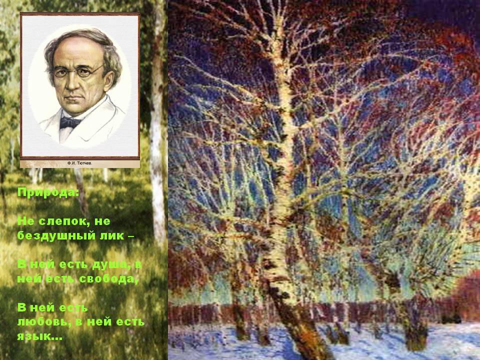 Не то , что мните вы, природа: Не слепок, не бездушный лик — В ней есть душа, в ней есть свобода, В ней есть любовь, в ней есть язык... Вы зрите лист и цвет на древе: Иль их садовник приклеил? Иль зреет плод в родимом чреве Игрою внешних, чуждых сил?.. .... Они не видят и слышат, Живут в сем мире, как впотьмах, Для них и солнцы, знать, не дышат, И жизни нет в морских волнах. Лучи к ним в душу не сходили, Весна в груди их не цвела, При них леса не говорили, И ночь в звездах нема была! Не их вина : пойми, коль может, Органа жизнь глухонемой! Души его, ах! Не встревожит И голос матери самой!. |
