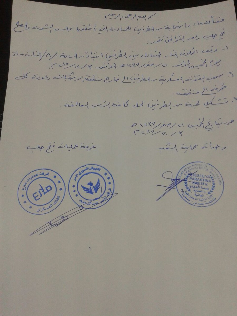 An agreement just signed between The FSA and YPG for cease fire started half hour ago .in Aleppo city and Provence. ![]() |