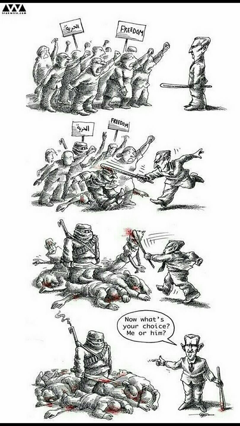 What's your choice - me or him? Няма какво много да се добави, като обобщение на ситуацията. Избор - Асад или Идил. Хизбула или Ал-Кайда. Иран или СА. |
