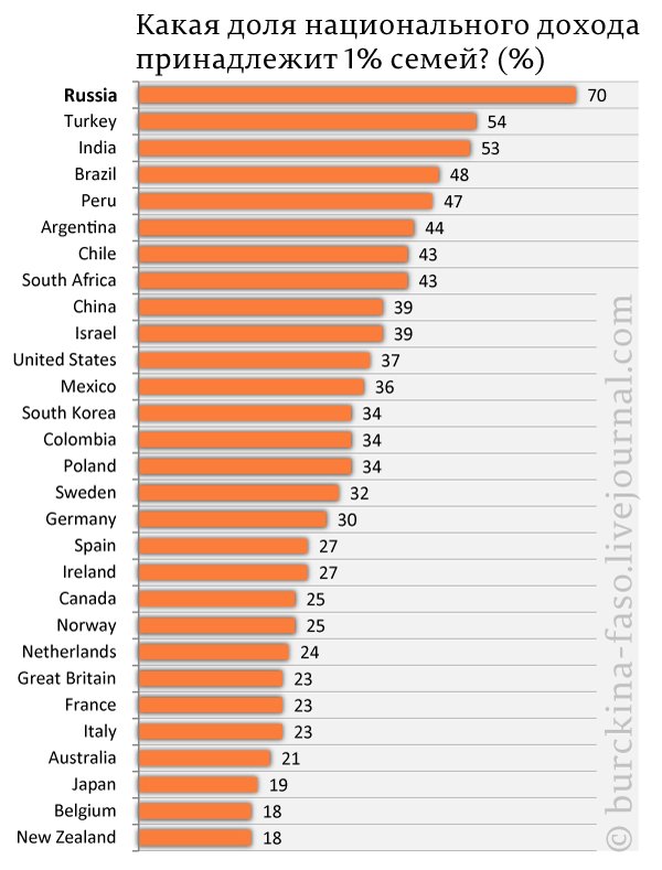 а днес само 1% от населението имат всичко, а всички останали нямат нищо. Това в най-голяма степен важи именно за Русия Граждане России, как и раньше, не готовы спокойно взирать на доходы «эффективных менеджеров» и одновременно с этим сомневаются в собственных возможностях зарабатывать больше. Относительно несправедливого распределения доходов в социуме ныне, как и 25 лет назад, говорит абсолютное большинство россиян (89%). Впрочем, сейчас граждане не возражают против того, чтобы государство вмешалось в этот вопрос. Если в 1989 году с идеей о том, что регуляция распределения доходов должна сократиться до минимума, соглашались 64% респондентов, то сегодня — всего 27%. Такую динамику продемонстрировал недавний опрос Всероссийского центра изучения общественного мнения (ВЦИОМ), в результате которого были опрошены 1,6 тыс. россиян в 132 населенных пунктах 46 регионов России. http://www.profi-forex.org/novosti-rossii/entry1008245104.html |