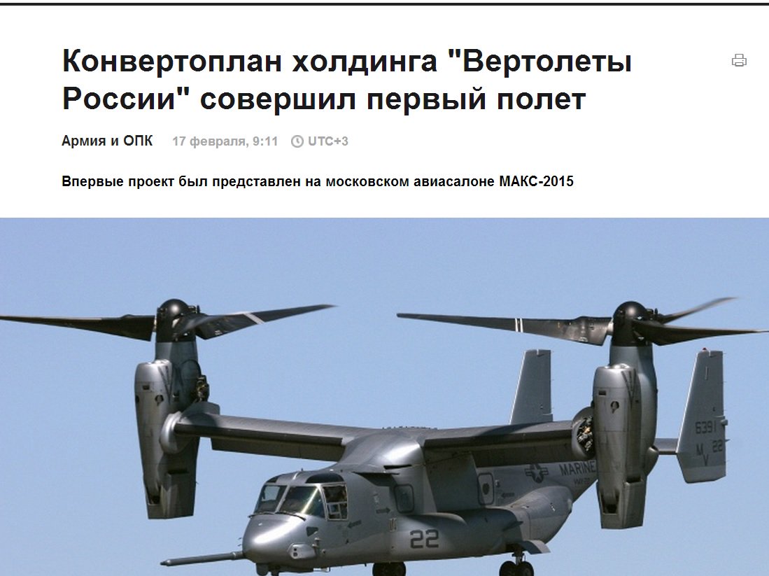| Е ми то си е написано в дописката - На данный момент только консорциум американских компаний Bell Helicopter и Boeing производит серийно конвертопланы, в частности, MV-22 Osprey. Его приобретает Корпус морской пехоты (КМП) и ВВС США Бордният номер, емблемата и надписа на морската пехота не са заменени на фотошопа със сърп, чук и петолъчка, нали? За да си помисли някой, че това е руският конвертоплан, за който става дума. | |