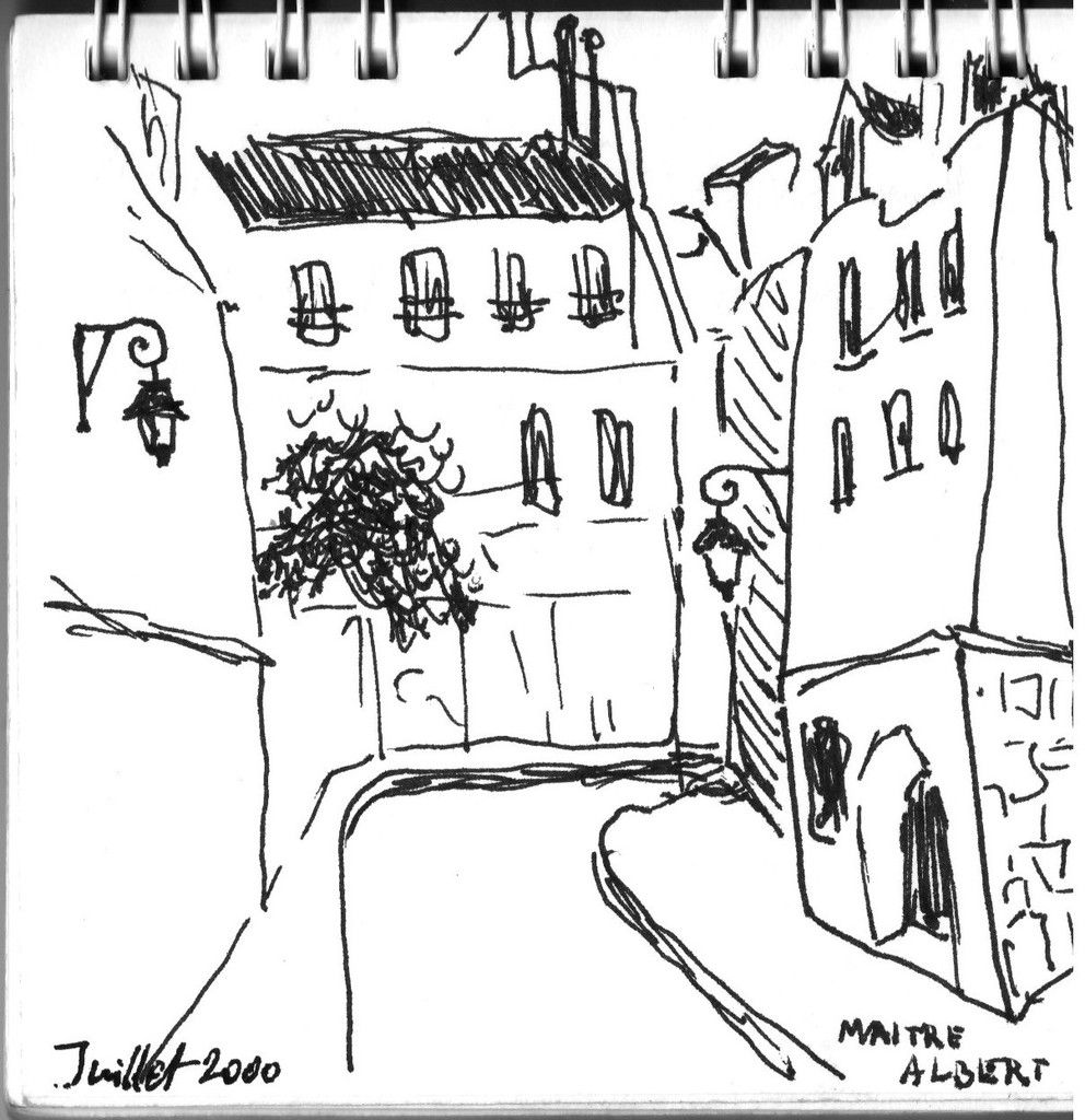 Ето я уличката! Намерих си скицника от 2000 г., знаех си аз! Rue Maître-Albert, кажи-речи моят "светия", както съм го запомнил. Днес носи името на Св. Алберт Велики (1193-1280) и е почти от неговото време. Добре се вижда наклонената зидария на фасадата (изобщо не е пред срутване!): ![]() | |