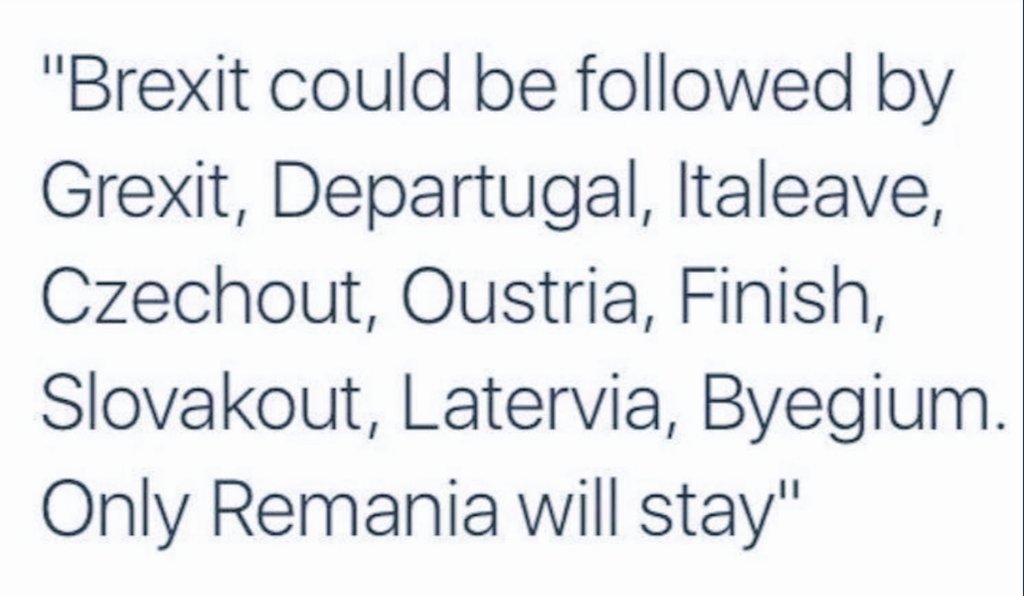 | What next? 1. Grexit 2. Departugal 3. Italeave 4. Czechout 5. Oustria 6. Finish 7. Slovakout 8. Latervia 9. Byegium https://pbs.twimg.com/media/ClyxtH4XIAE9LLy.jpg:large ![]() |