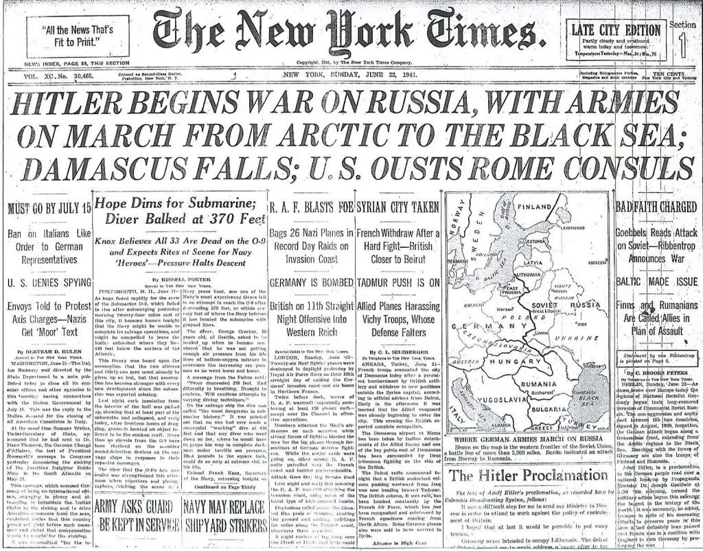 | Рибентроп: „Предайте в Москва, аз бях против!” ОТ РЕКА БУГ ДО „ГОВОРИТ МОСКВА” - ПЪРВИЯТ ДЕН НА ВОЙНАТА 22 юни 1941 година, неделя, преди обяд. Милиони граждани на Съветския съюз се наслаждават на почивния ден – готвят се за излет, за плаж, среща с роднини и приятели, разходка с децата сред природата и в зоопарка, за релаксиращо мързелуване на сянка с вестник в ръка и с новините от 21 юни. Москва тръпне от нетърпение да се потопи без остатък в топлия ден. След необичайно студената зима, топлото лято е като небесна милувка. В парк „Горки” атракционите работят на пълни обороти, на стадион „Динамо“ върви футболен мач. „Мосфилм“ се готви за премиерата на лиричната комедия „Четири сърца”, в която играе любимата актриса на руските зрители – Валентина Серова. Никой не подозира, че този ден е подготвил различна съдба за всеки от тях. Едни ща станат герои, други ще бъдат убити, трети ще останат сираци или инвалиди за цял живот, четвърти ще попаднат в плен или в концлагер, докато близките им умират от глад и студ. Душите на хиляди деца ще се възнесат към небето преди да са разбрали дали Дядо Мраз съществува; преди да стъпят в юношеството, да се влюбят и да създадат свои деца. Други хиляди ще целунат за последен път любимите си хора, ще си направят последната семейна снимка за спомен, преди пътищата им да се разделят завинаги. Никой още не знае, че след войната много от обраслите в юнска трева и изпъстрени с полски цветя райски кътчета ще се превърнат в гробища, и върху тях ще „цъфнат” хиляди надгробни плочи. Войната вече се е настанила в юнския ден на Украйна, Беларус и Прибалтика, но тътенът й още не е докоснал покоя на Москва, водите на реките в Подмосковието все още са бистри… 21 юни в 21:00 часа, Украйна: В участъка на Сокалската комендатура е арестуван немски войник, ефрейтор Алфред Лискоф, при опит да преплува река Буг. От показанията на началника на 90-ти граничен отряд, майор Бичковски: “Поради факта, че преводачите в звеното са слаби, повиках учител по немски език … и Лискоф повтори същото, което вече беше казал, че германците се готвят да нападнат СССР в зората на 22 юни… Още не беше свършил разпита на войника, когато от посока на Устилуг се чу силен артилерийски тътен. Разбрах, че германците са открили огън по наша територия, което потвърди думите на войника. Веднага започнах да правя опити да се свържа с коменданта, но връзката беше прекъсната”. 21:30 часа: В Москва се провежда разговор между комисаря на външните работи Молотов с германския посланик Шуленбург. Молотов протестира във връзка с многобройни нарушения на съветската граница от германски самолети. Шуленбург шикалкави, отбягва отговорите. От мемоарите на ефрейтор Ханс Toйхлер: „В 22 часа ни построиха и зачакахме заповедта на фюрера. И накрая ни казаха защо сме тук. Не за да ни прехвърлят в Персия, за да накажем англичаните с разрешението на руснаците. И не за да приспим британците, а след това бързо да се прехвърлим към Ламанша и да влезем в Англия. Не. Ние, войниците на Великия райх, бяхме в очакване на война със самия Съветски съюз. И няма сила, която може да спре движението на нашите войски. За руснаците това ще бъде истинска война, а за нас – победа. Ние ще се молим за нея“. 22 юни 00:30 часа: До съветските военни окръзи е изпратена директива №1, съдържаща заповед за заемане на позиции по границите, в