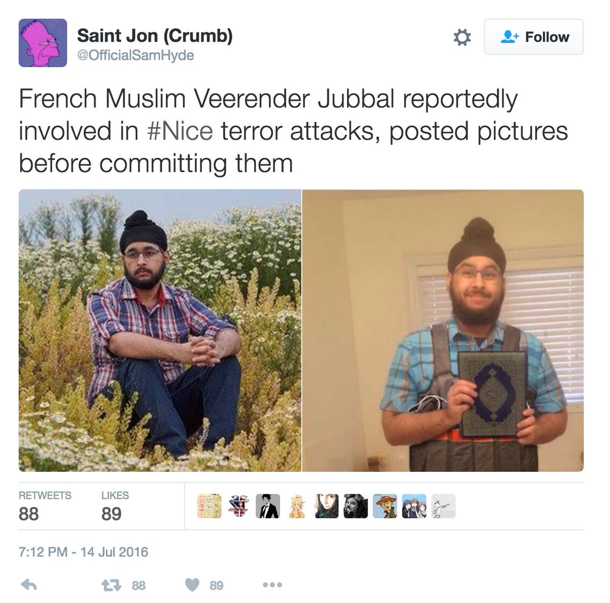 | Simran Jeet Singh @SikhProf 5h5 hours ago People are wrongly identifying my Sikh friend as being responsible for the #Nice attack. Please help end the rumors. Media Fooled by Deplorable, Irresponsible, Absolutely Not Funny Trolling of Gamergate Critic Media outlets have been fooled by a joke photo long in circulation into believing that a Photoshopped picture of notorious anti-GamerGate critic Veerender Jubbal was one of the suspects responsible for the recent Paris terrorist attacks that occurred on Friday. The original picture of Jubbal featured him standing in a bathroom in front of the mirror, taking a selfie with his iPad. This was then changed and edited by trolls to add a suicide-bomb vest to Jubbal, change the iPad into a Koran, and add a dildo into the corner of the photo. A group of trolls then spread the picture around with the sole purpose of fooling the media, and the picture was picked up shortly after. http://www.breitbart.com/tech/2015/11/14/media-fooled-by-deplorable-irresponsible-absolutely-not-funny-trolling-of-gamergate-critic/ | |