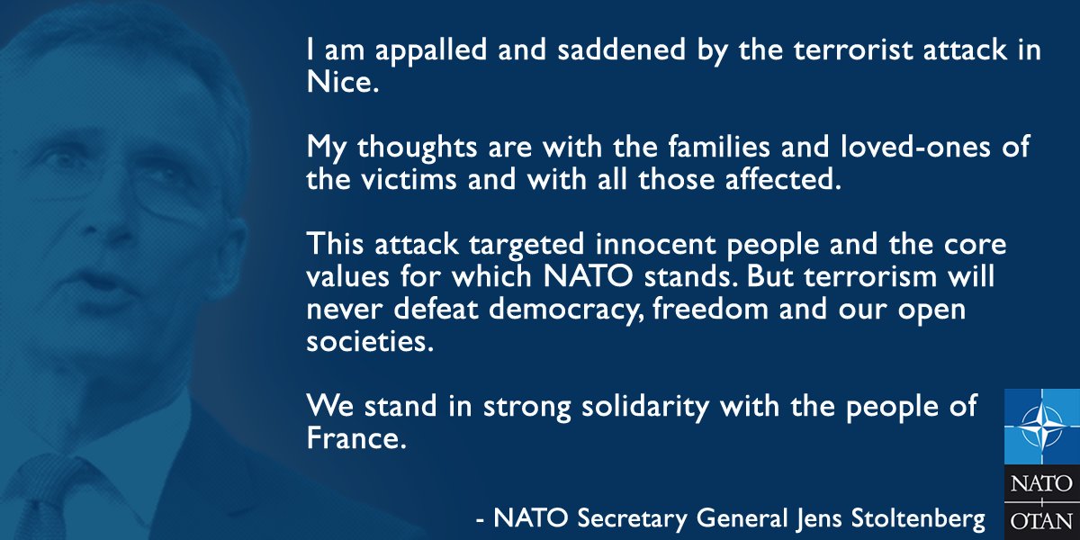 NATO Secretary General statement on terrorist attack in Nice http://www.nato.int/cps/en/natohq/news_134186.htm?utm_campaign=160715%2Battack%2Bnice | |