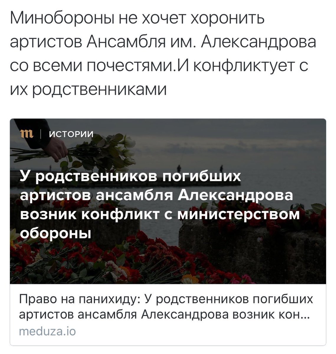 «У нас цель простая — чинно проститься, отпеть по-человечески, — говорит друг семьи Столяр Петр Новиков. — У Минобороны другая цель — по-быстрому всех закопать и забыть, чтобы никто не пикнул». https://meduza.io/feature/2017/01/12/pravo-na-panihidu | |