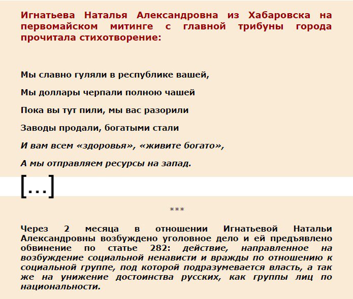 | Суд постановил запретить стихотворение про "Будьте «здоровы», «живите богато», Насколько позволит вам ваша зарплата" https://reestr.rublacklist.net/rec/136208/ http://www.otchizna.info/Otchizna/Stihi.htm |