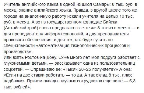 rki 22 Яну 2017 18:12 Мнения: 20,177 От: Albania Скрий: Име,IP За ЛЪЖАТА и КРАКАТА и ... https://vk.com/topic-569446_22989244?offset=20 УЧИТЕЛЯ АНГЛИЙСКОГО ЯЗЫКА Обсуждения Просмотр темы 85 Ольга Рогожникова 8 июл 2010 в 18:43 А я живу на Украине з.п 700 грн (2000 р.) Мелочь, а приятно.... Диана Щелканова 17 авг 2010 в 15:38 я тоже из якутии Мне нравится Показать список оценивших Ответить ( За пропагандистие - 31 часа работа 23 - 27 000 руб... Мъъъъъъъъъъъъъъкаааааааааааааааааааааа Мария Солдатенко 4 мар 2011 в 16:35 Москва. Стыдно говорить после прочитанного....пока мы как сыр в масле.Я молодой специалист,работаю полгода, нагрузка 21 час + 3 часа кружка.З П 38 000 рублей.разряд 8. Катерина Лоенко 23 авг 2011 в 17:25 из Новосибирской области, в 2010 году за 25 часов около 15 получала (сейчас в декрете) Оксана Елисеева 17 фев 2013 в 15:35 Екатеринбург: первый год, 29 часов (2-5е классы),средняя з\п 18.500. не знаю как в других школах,может от директора зависит, нам постоянно стимулирующие дают.думаю что без стимулирующих вообще мало было бы. перед новым годом 10тыщ премии дали! 28 вышло. неплохо,я считаю)) Мария Рылова 18 июл 2015 в 15:12 Катерина, у меня папа был учителем высшей категории, 20-30 т. р. получал, новичкам такое не светит, ну, еще от нагрузки зависит, и по-моему от предмета. Он говорил, что некоторые получали 40-60 тысяч. Я начинала преподавать в лицее, где-то 1500 тысячи в месяц - 8 академических часов в неделю. Но это была очень смешная зарплата... там снимается 13% подоходный, 10% за отсутствие опыта и 18% НДС. то есть час вместо положенных 91,93 р., стоил около 45 р. Петербург. КРАКАТА НА ЛЪЖАТА http://www.woman.ru/psycho/career/thread/4479482/ Гость Препод в гос. университете, кандидат филол.наук, доцент, ставка - 0,25 (больше не дают), на руки - 8800 руб. Почему с такими достижениями Вы не хотите заниматься репетиторством с детьми обеспеченных родителей? Там оч хорошо платят и Вас оценят. Посмотрите в интернете вакансии или в специальных агентствах где подбирают персонал в такие семьи. Так я и занимаюсь репетиторством 4. гость | 03.10.2014, 19:23:52 [3034729193] Москва,репетитор,выходит 50-60 тыс, я выпускница вуза.летом-ноль. Ричко взе наградата !![]() |