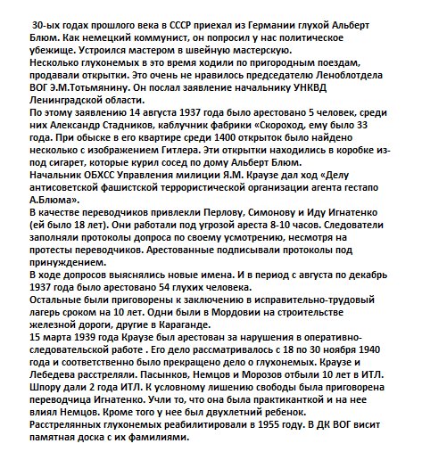 В 1937 НКВД арестовало 54 глухонемых за терроризм,35 из них расстреляли,остальным дали по 10 лет При диктатуре все враги, даже, если молчишь ![]() |