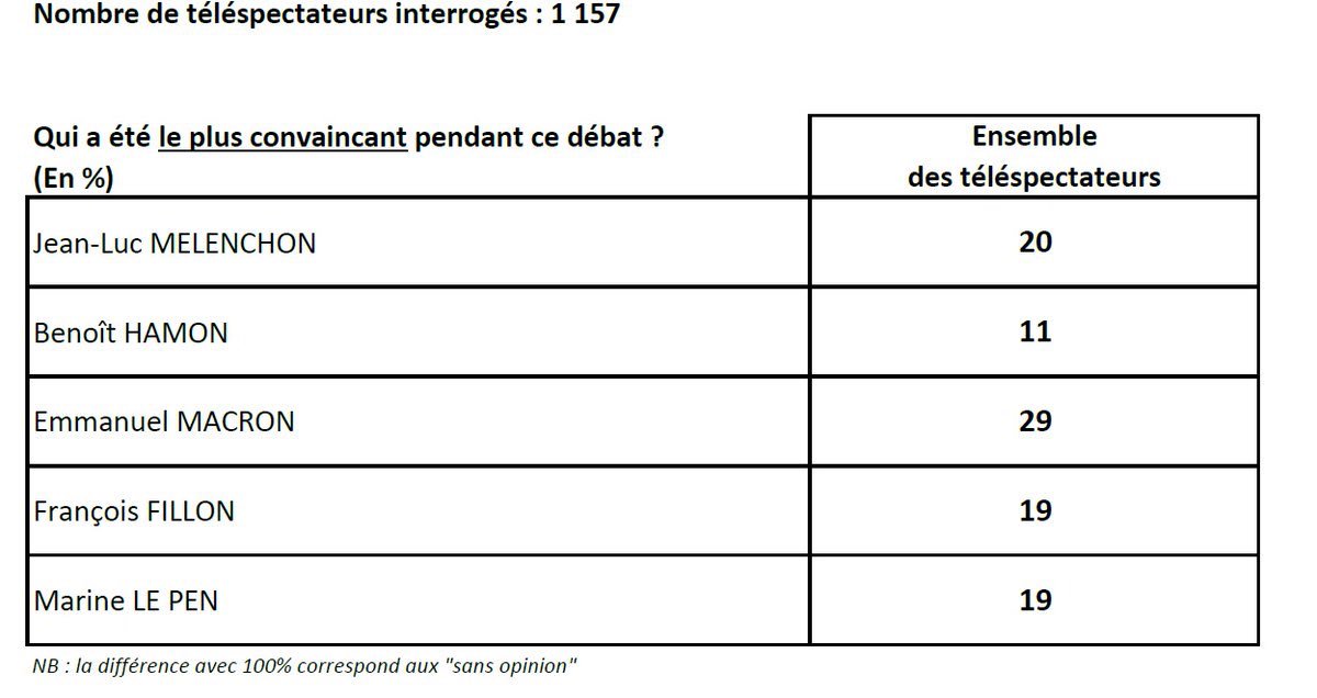 Меланшон измести Фийон от третото място Présidentielle : pour la première fois, un sondage place Jean-Luc Mélenchon troisième au premier tour, devant François Fillon Par franceinfo – France Télévisions Mis à jour le 09/04/2017 | 19:16 – publié le 09/04/2017 | 18:36 A 14 jours du premier tour de la présidentielle, Jean-Luc Mélenchon n'en finit plus de progresser. Pour la première fois depuis le début de la campagne, un sondage place le candidat de la France insoumise dans la position du troisième homme. Selon une étude Kantar Sofres-Onepoint pour LCI, RTL et Le Figaro, il est crédité de 18% des intentions de vote, devant François Fillon (17%). Jean-Luc Mélenchon, qui donnait un grand meeting à Marseille, dimanche 9 avril, enregistre une hausse de 6 points par rapport à un précédent sondage réalisé entre les 15 et 17 mars. Marine Le Pen et Emmanuel Macron font toujours la course en tête, mais ils subissent tous les deux une baisse de 2 points (24%). Loin derrière, Benoît Hamon (9%), Nicolas Dupont-Aignan (3,5%), Philippe Poutou (2,5%), François Asselineau (1%), Nathalie Arthaud, Jean Lassalle et Jacques Cheminade (0,5%). Натисни тук |