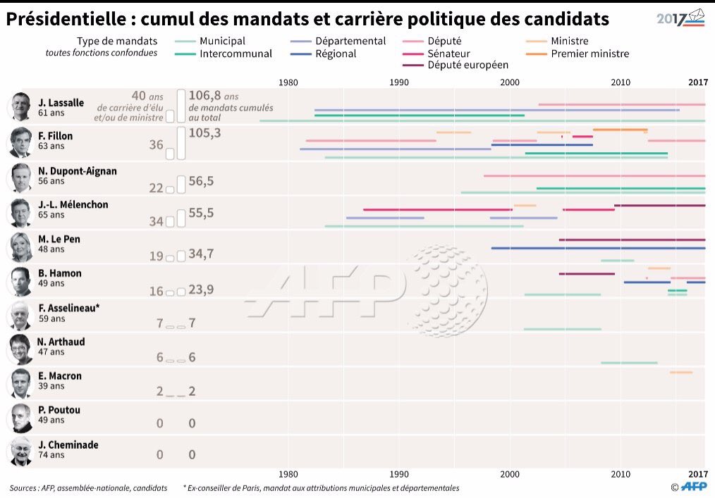 | The "anti-system" candidates - Fillon, 105 years of cumulative public mandates. Mélenchon, 55 years. Le Pen, 35 years. Macron - 2 yrs (AFP) ![]() |