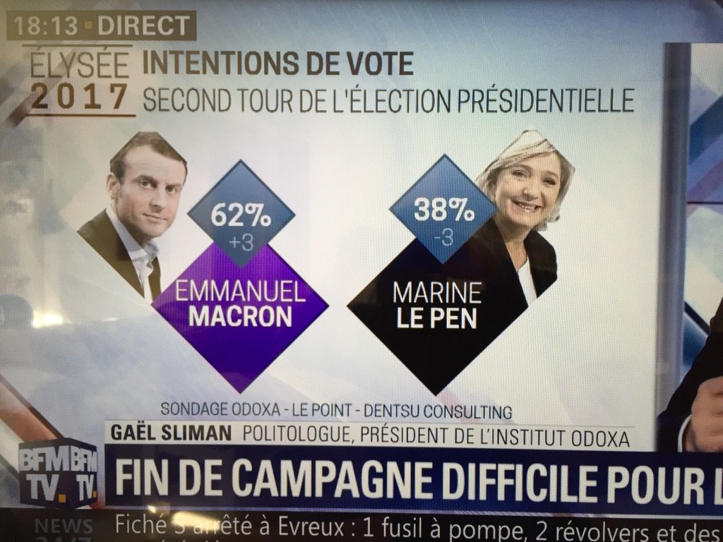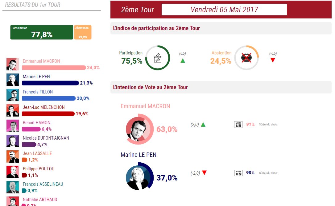 | След снощния #GranDebat Макрон е добавил един процентен пункт и вече води с 61 към 39 %. Отделно от това се увеличиха и твърдо решилите да гласуват за него - 89 %, докато при Льо Пен има спад с 2 % до 86 %. Au lendemain du débat de l'entre-deux-tours, Emmanuel Macron gagne un point d'intentions de vote dans le sondage quotidien Ifop-Fiducial pour Paris Match, CNews et Sud-Radio. Emmanuel Macron a effacé ses pertes. Alors qu'il avait reculé de deux points depuis le premier tour, le candidat d'En Marche! en a regagné deux depuis lundi. Il est désormais crédité de 61% (+1 par rapport à mercredi) d'intentions de vote, contre 39% pour Marine Le Pen (-1). Concernant le pronostic de victoire, 57% des sondés (stable) pensent qu'Emmanuel Macron va l'emporter, 26% (+1) ne savent pas et 17% (-1) croient à la victoire de Marine Le Pen. Натисни тук |