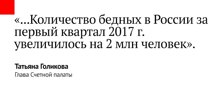 И това ли е от някой прясно регистриран topnews-ru-ru.ru Информацията може да се намери на поне 1000 места. Например в "Комсомольская правда", който е възможно най-казионният информационен източник: 22 миллиона россиян живут за чертой бедности Об этом перед Совфедом заявила глава Счетной палаты Татьяна Голикова За первый квартал 2017 года количество живущих за чертой бедности увеличилось более чем на 2 млн. человек и составило 15% населения, отметила глава Счетной палаты. По данным Росстата, в 2016 году такие доходы были у 13,5% россиян. А официальный прогноз, прописанный в бюджете, обещал, что к концу года доля людей, получающих меньше прожиточного минимума, должна сократиться до 12,9%. Как видим реальная жизнь разошлась с прогнозом. Напомним, ранее зампредседателя правительства России Ольга Голодец назвала уникальным (употребив это слово в негативном контексте) явление, когда россияне остаются бедными при наличии работы. - Та бедность, которая в стране есть и фиксируется,— это бедность работающего населения. Это уникальное явление в социальной сфере — работающие бедные, - заявила Голодец. КСТАТИ Около 10% россиян признались, что им не хватает денег на продукты Около 10% россиян признались, что им не хватает денег даже на покупку продуктов. Об этом сообщили во Всероссийском центре изучения общественного мнения (ВЦИОМ). Исследователи пришли к выводу, что благосостояние граждан страны пока не вернулось на докризисный уровень https://www.kp.ru/daily/26698/3722516/ |