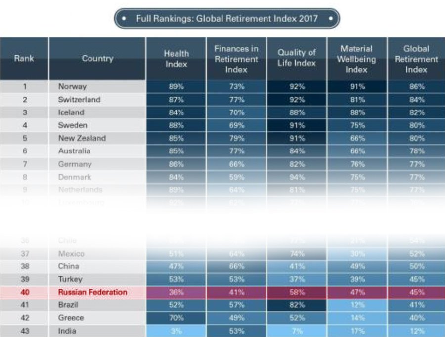 Россия вошла в пятерку худших стран для пенсионеров Согласно глобальному пенсионному индексу (Global Retirement Index), Россия остается одной из худших стран в мире для пенсионеров. В рейтинге этого года (.pdf), в который вошли 43 страны, Россия заняла 40-ю строчку. https://ngam.natixis.com/us/resources/2017-global-retirement-index Рейтинг измеряет, насколько комфортно выходить на пенсию в той или иной стране. В своих расчетах специалисты французской финансовой корпорации Natixis анализируют четыре фактора: финансовую ситуацию, материальную обеспеченность, качество жизни и здоровье. Каждый из параметров оценивается в диапазоне от 0 до 100%. В 2016 году Россия также занимала 40-ю позицию, однако за год уменьшился общий полученный ею балл — с 46% до 45%. При этом авторы рейтинга отмечают, что в России улучшились показатели качества жизни и финансовой обеспеченности пенсионеров. Лидерами рейтинга стали Норвегия (86%), Швейцария (84%), Исландия (82%), Швеция (80%) и Новая Зеландия (80%). В топ-10 также вошли Австралия (78%), Германия (77%), Дания (77%), Нидерланды (77%) и Люксембург (76%). Последние три места рейтинга заняли Бразилия (41%), Греция (40%) и Индия (12%). https://www.kommersant.ru/doc/3361655 |