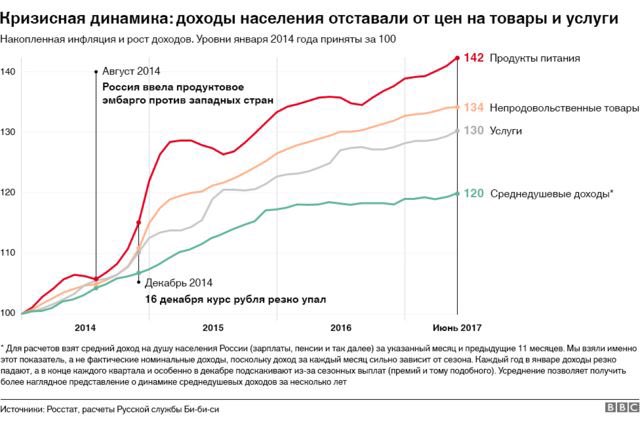 Краткосрочный рост доходов россиян в январе 2017 г. не переломил тренд, говорится в новом мониторинге Национального исследовательского университета (НИУ) Высшей школы экономики (ВШЭ): с 2014 г. реальные доходы россиян упали уже почти на 20%. «Начиная с февраля статистика снова фиксирует падение, – констатирует НИУ ВШЭ. – По итогам первых пяти месяцев 2017 г. его глубина достигла 1,8% по отношению к соответствующему периоду прошлого года. Таким образом, май 2017 г. стал, по сути, тридцать первым месяцем сокращения реальных доходов россиян и по сравнению с октябрем 2014 г. – последним периодом устойчивого роста реальных доходов: падение за прошедшее время составило 19,2%». Реальная зарплата при этом продолжает вялый восстановительный рост – по итогам первых пяти месяцев 2017 г. прирост составил 2,9% к прошлогоднему уровню. Падение реальных пенсий было прервано единовременной выплатой 5000 руб. в январе, но в мае этот показатель вернулся к уровню годичной давности. В целом с октября 2014 г. по апрель 2017 г. реальные пенсии сократились на 6,9%. «Рост пенсий и зарплат на фоне падения денежных доходов свидетельствует о том, что высокими темпами сокращаются такие источники денежных поступлений, как доходы от собственности и предпринимательский доход», – констатирует НИУ ВШЭ. По данным мониторинга, с ноября 2014 г. по конец мая 2017 г. розничный оборот товаров и услуг сократился на 19,4%, прирост потребительских цен составил 25,7%, причем продукты подорожали на 28,5%, непродовольственные товары – на 26,2%, услуги – на 21,3%. https://www.vedomosti.ru/politics/news/2017/08/01/727430-niu-dohodi |