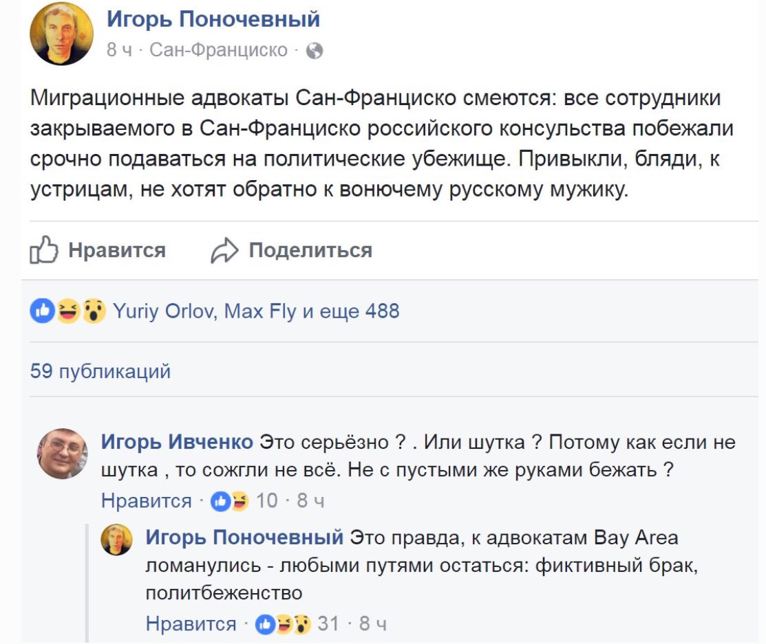И към добър адвокат са се насочили Работники российского консульства в Сан-Франциско консультируются о политубежище в США Некоторые сотрудники прекратившего с сегодняшнего дня свою работу Генерального консульства России в Сан-Франциско обратились к иммиграционным адвокатом с просьбой о содействии в получении политического убежища. Президент юридической компании из Сан-Франциско American Corporate Services Григорий Финкельсон в интервью ForumDaily сообщил, что за минувшие пару дней он уже получил несколько звонков от бывших сотрудников консульства в Сан-Франциско, просивших его помочь с получением политубежища в США. «На самом деле, такая возможность не так уж невероятна, как может показаться. Теоретически, за несколько лет жизни в Америке в судьбе человека могут произойти серьезные изменения. К примеру, он может осознать себя геем и даже иметь историю гомосексуальных отношений. Точно также человек может стать за это время «Свидетелем Иеговы» или разочароваться в политике нынешних российских властей. Если, допустим, он предпринимал какие-то реальные действия по поддержке оппозиционных политиков, он может опасаться, что это станет известно на родине. Также за время пребывания в США друзья или родственники человека в России могут подвергнуться уголовному преследованию. Ну и, безусловно, важной причиной является факт сотрудничества бывшего консульского работника с американским правительством и спецслужбами, если таковой имел место», – пояснил он. Григорий Финкельсон добавил, что сам факт подачи на убежище дает заявителю возможность жить и работать в США до момента рассмотрения дела (а в среднем этот срок может составлять 2-3 года). В случае отказа в предоставлении статуса искатель убежища может оспорить решение, и весь процесс может затянуться на 7-9 лет, в течение которых бывший сотрудник консульства сможет законно проживать в Соединенных Штатах. http://www.forumdaily.com/rabotniki-zakrytogo-rossijskogo-konsulstva-v-san-francisko-konsultiruyutsya-o-vozmozhnosti-poluchit-politicheskoe-ubezhishhe-v-ssha/ https://ruposters.ru/news/02-09-2017/sotrudniki-konsulstva-poprosili-politubezhishha |
