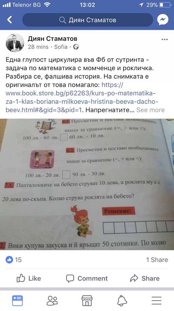 | тормозчиянов, не е фалшива история. това беше потвърдено: Кире 13 Фев 2018 09:45 Натисни тукСега обаче е редно да се извиня, понеже разбирам (от жена ми), че във второто издание на това помагало по математика имало печатна грешка. Не мисля обаче, че е направено с някаква подмолна цел. | |