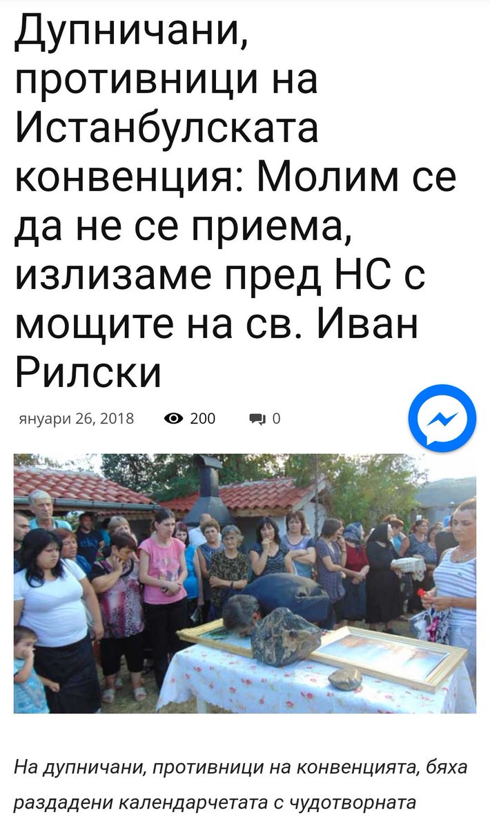 Голяма част от дупничани се заканиха, че ще борят Истанбулската конвенция с молитви към Рилския чудотворец и чудотворната скална икона на Богородица с Младенеца от парк „Рила”. „Готови сме да тръгнем с мощите на светеца от Рилската обител към Народното събрание, за да предотвратим това нещо”, коментираха дупничани. Хиляди календарчета с неръкотворната дупнишката Богородица бяха отпечатани от жителите на Дупница, за да се раздават на миряните срещу ратификацията на Истанбулската конвенция. Откривателката на дупнишката Богородица от парк „Рила” Дени Милева сподели: „Ние сме дали православната вяра на най-големия славянски народ – Русия, и ние трябва да опазим православието. Тази битка е наша. Искат да забият нож в гърба на Русия”, заяви Милева. http://viaranews.com/2018/01/26/458374578548545845845/ |